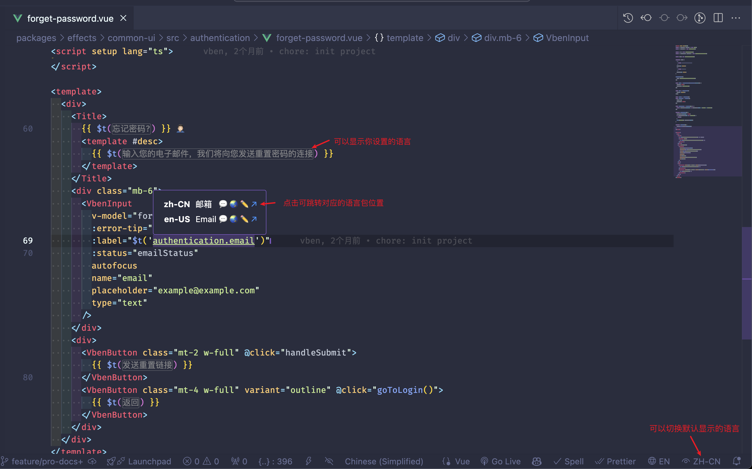 如果你使用的 vscode 开发工具,则推荐安装 i18n Ally 这个插件。它可以帮助你更方便的管理国际化的文案,安装了该插件后,你的代码内可以实时看到对应的语言内容: