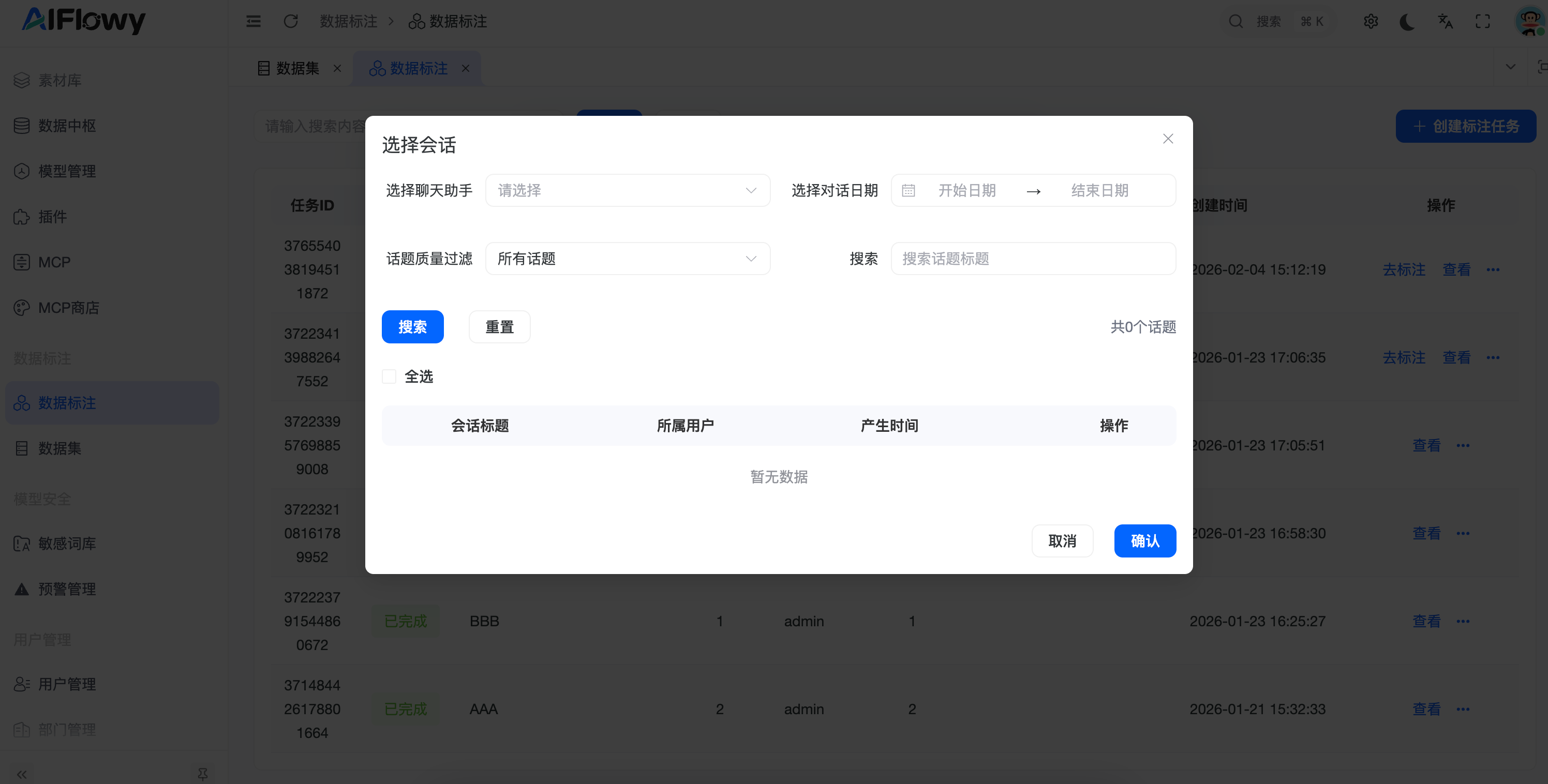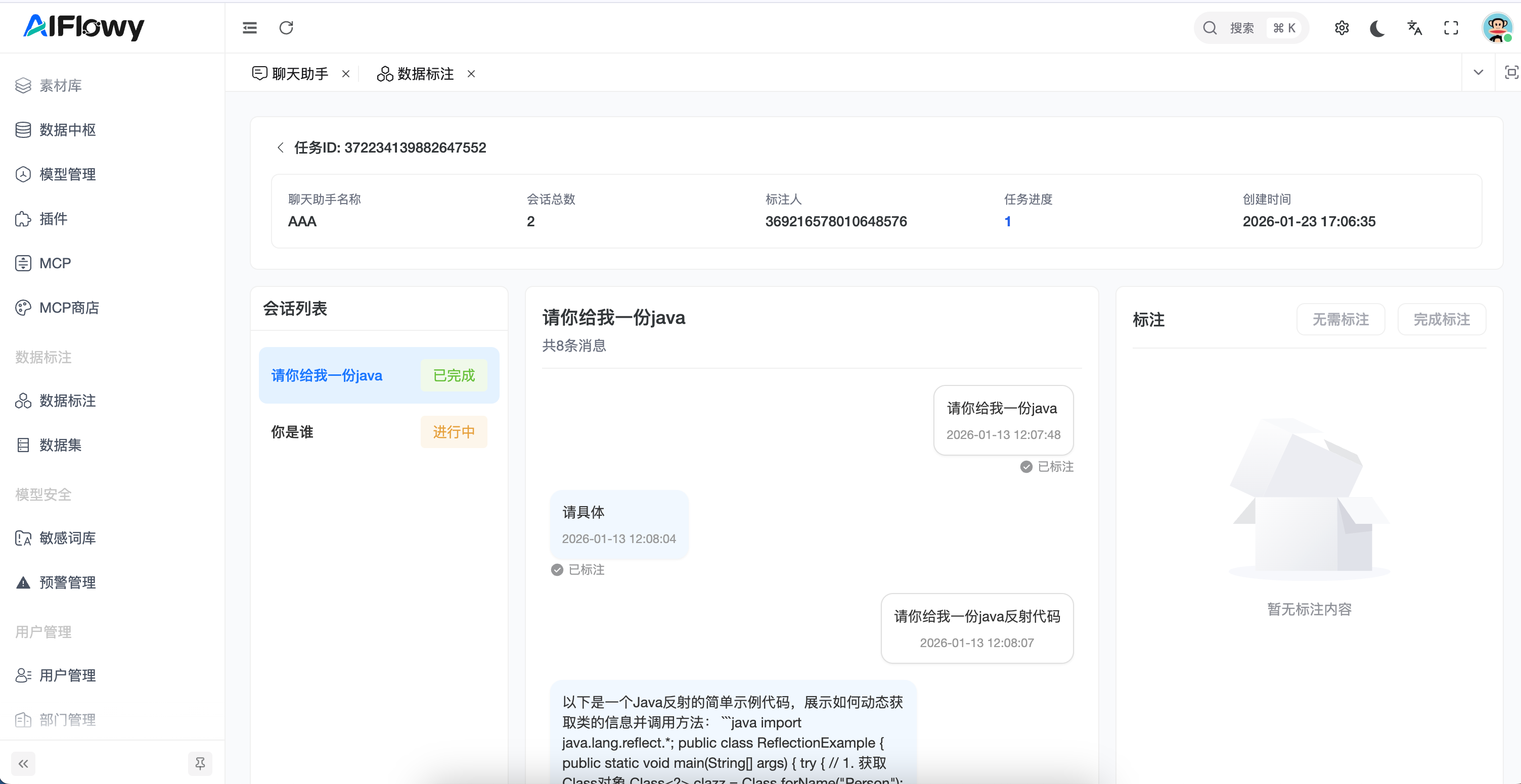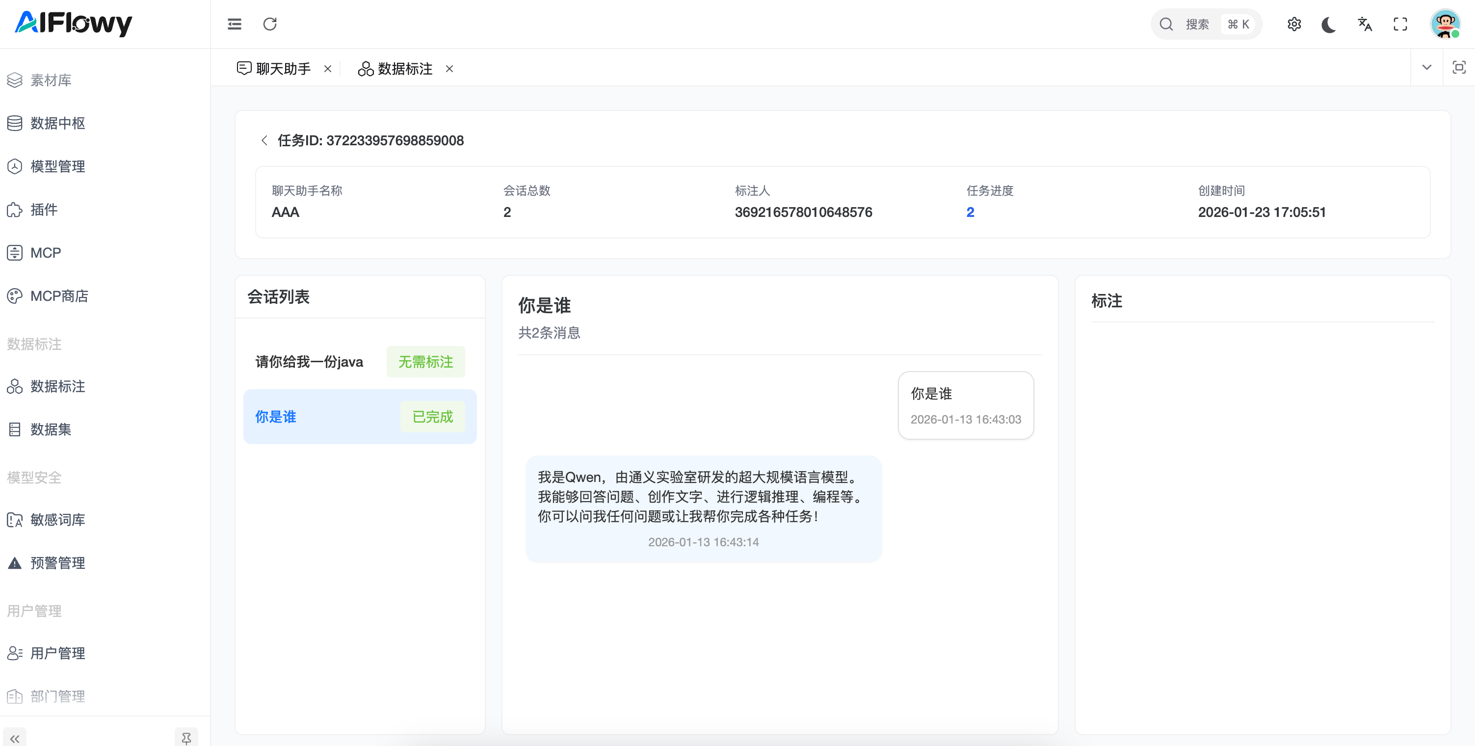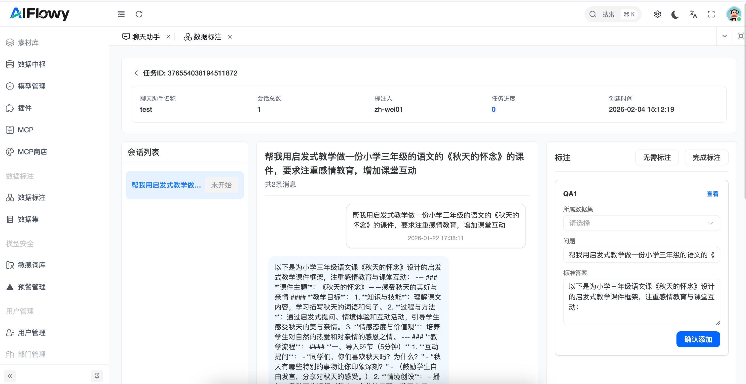 - 会话预览:标注员可预览原始对话详情,查看用户提问与系统回答的完整逻辑。