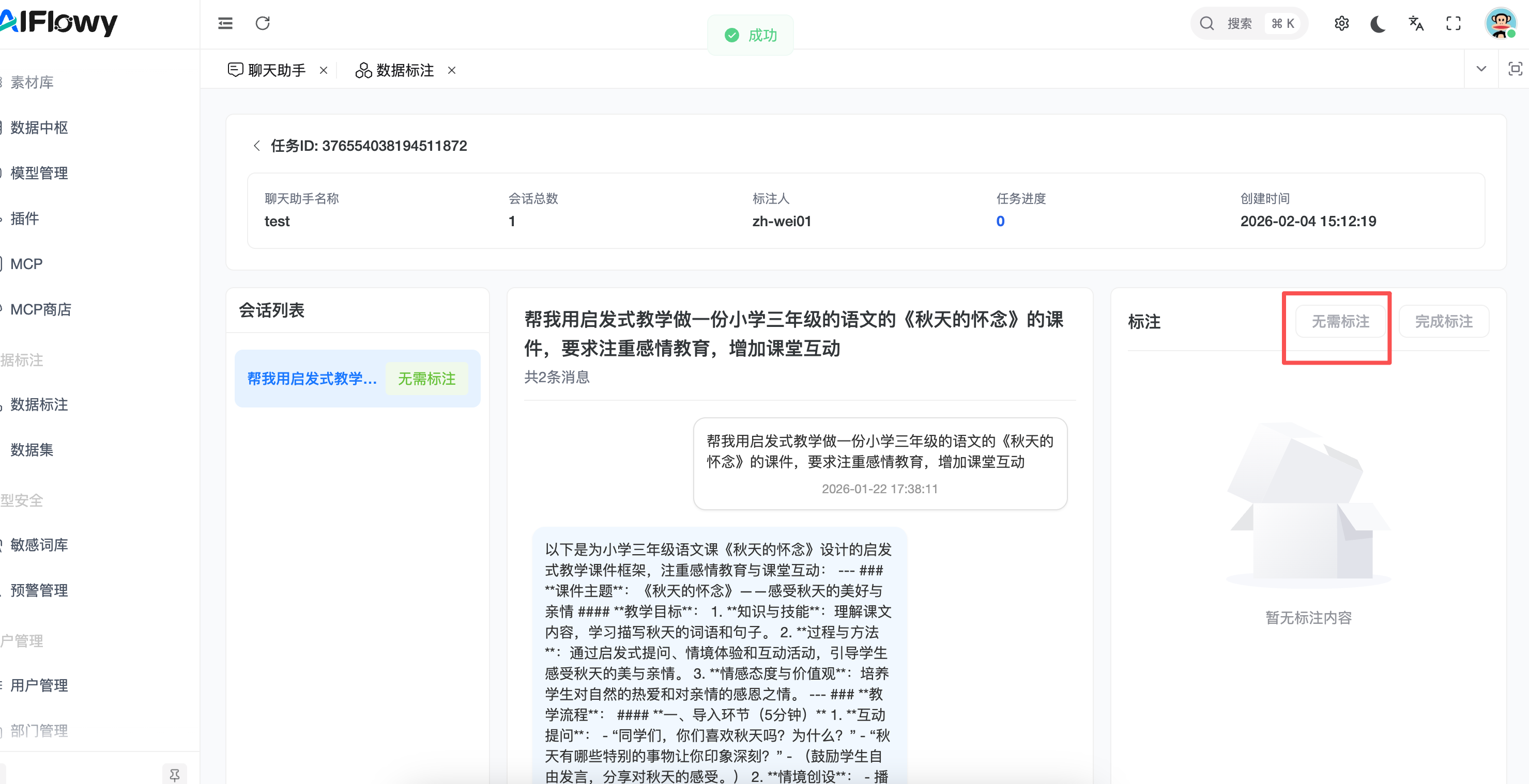 状态处理:对于无价值的对话,可标记为无需标注;处理完成后点击完成标注。