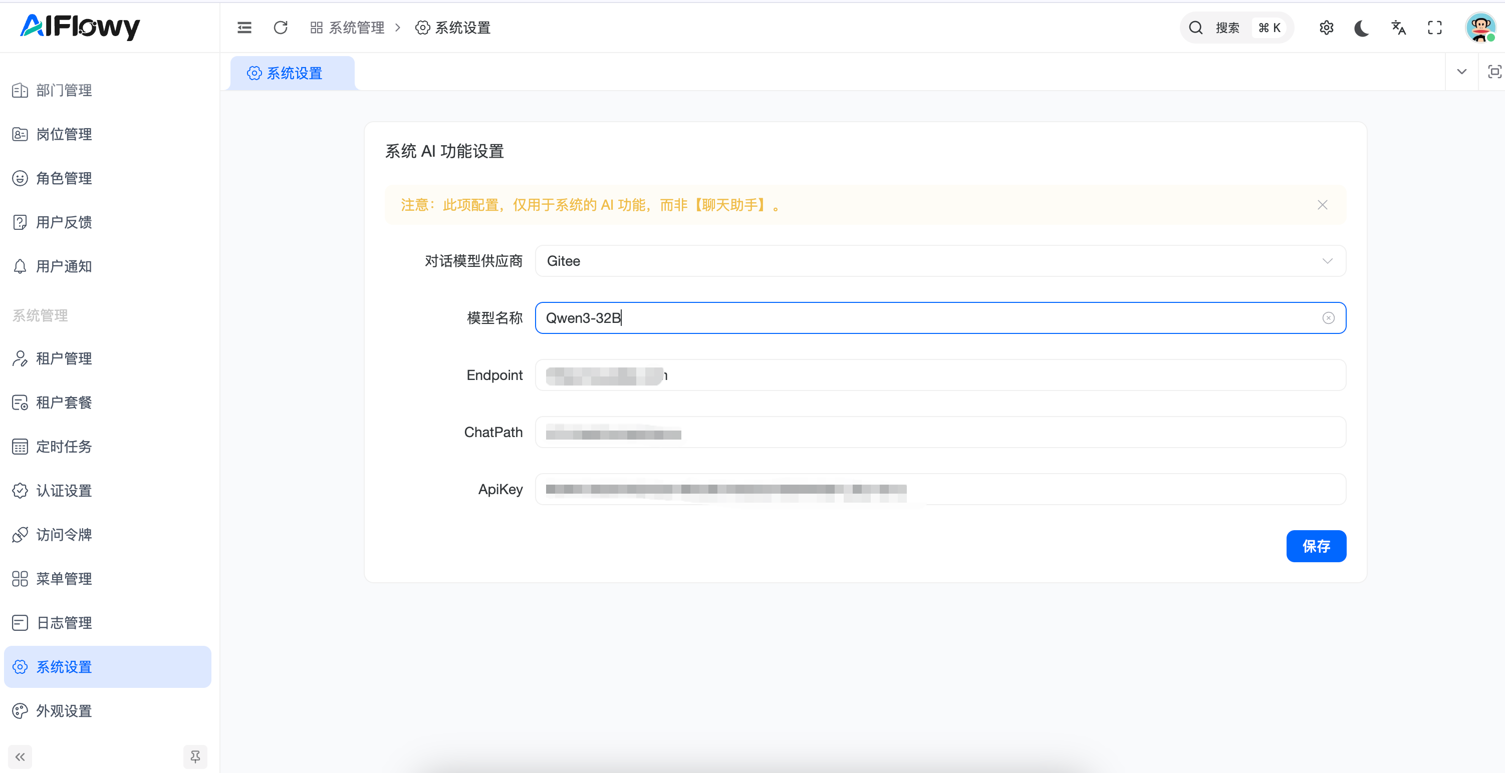 系统设置 模块是 AIFlowy 平台的底层核心配置中心。管理员在此处配置的 AI 模型参数将直接支撑整个系统的原生 AI 功能