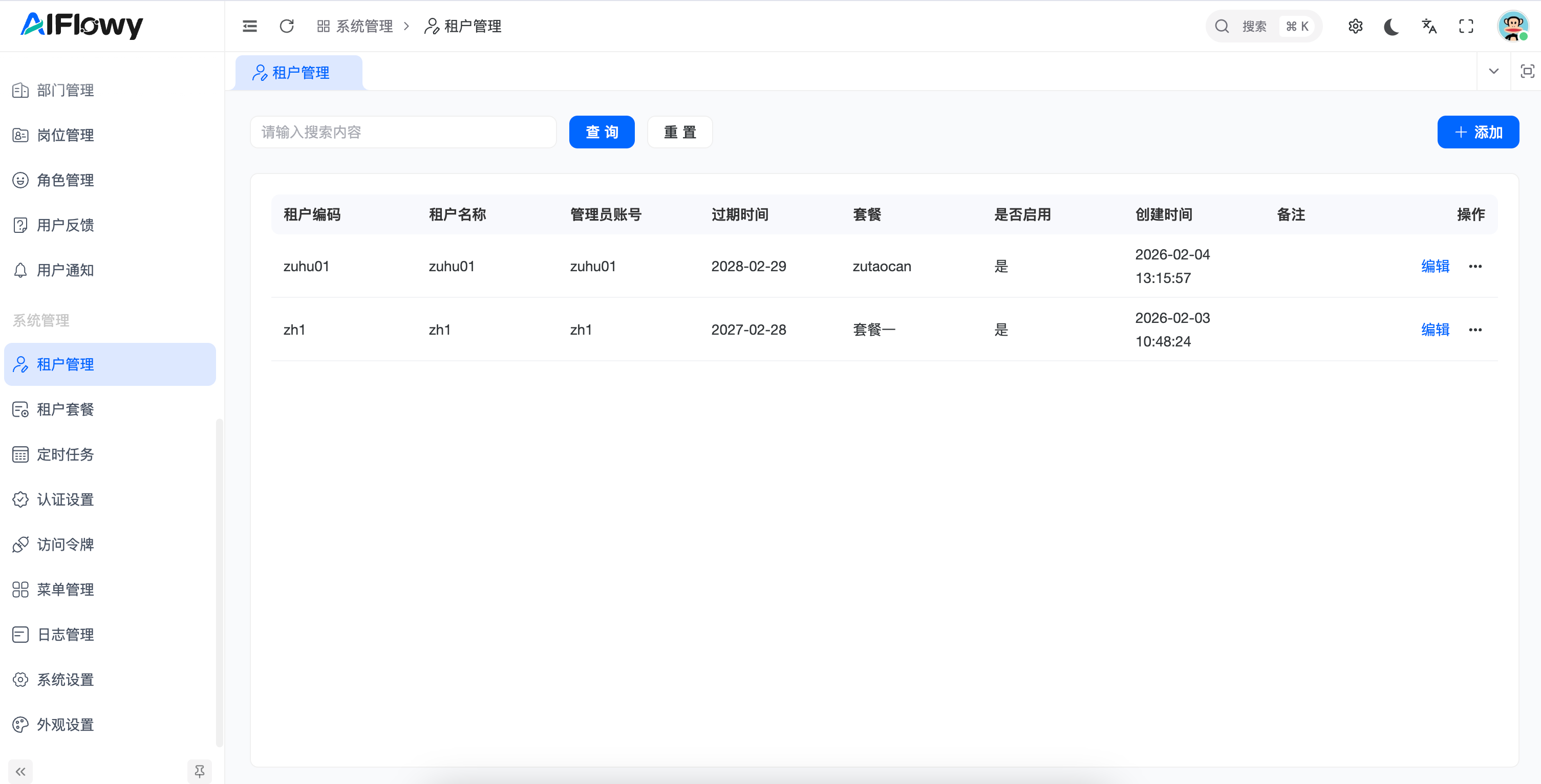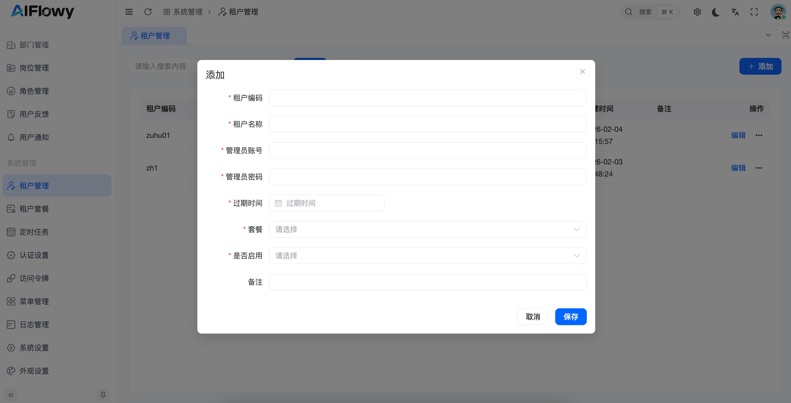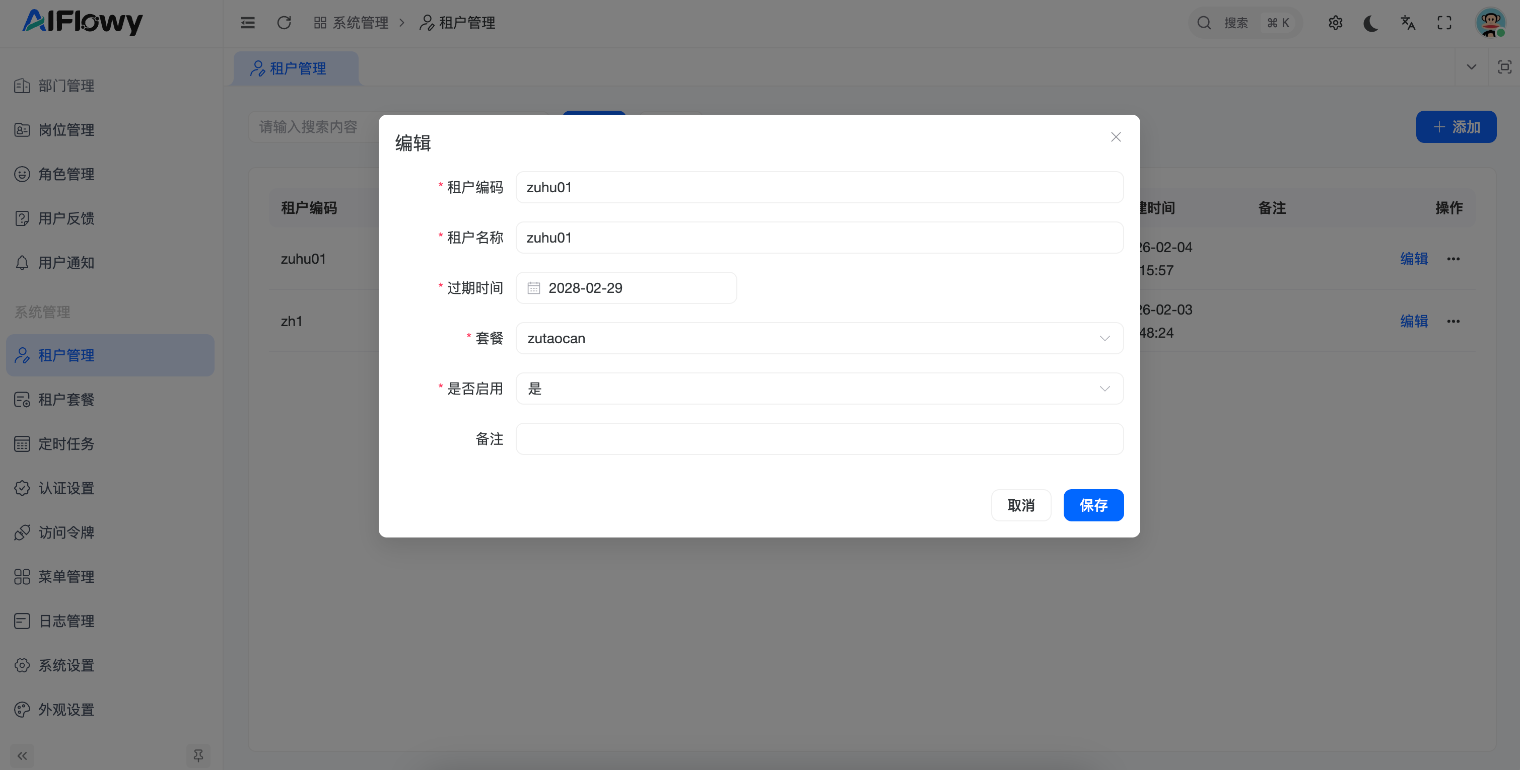 租户管理 是 AIFlowy 平台面向多租户架构的核心管理模块。管理员可以通过该功能实现对不同企业或组织(租户)的隔离管理,包括账号开通、套餐分配、有效期控制以及状态监控,确保平台资源的高效分配与安全隔离。