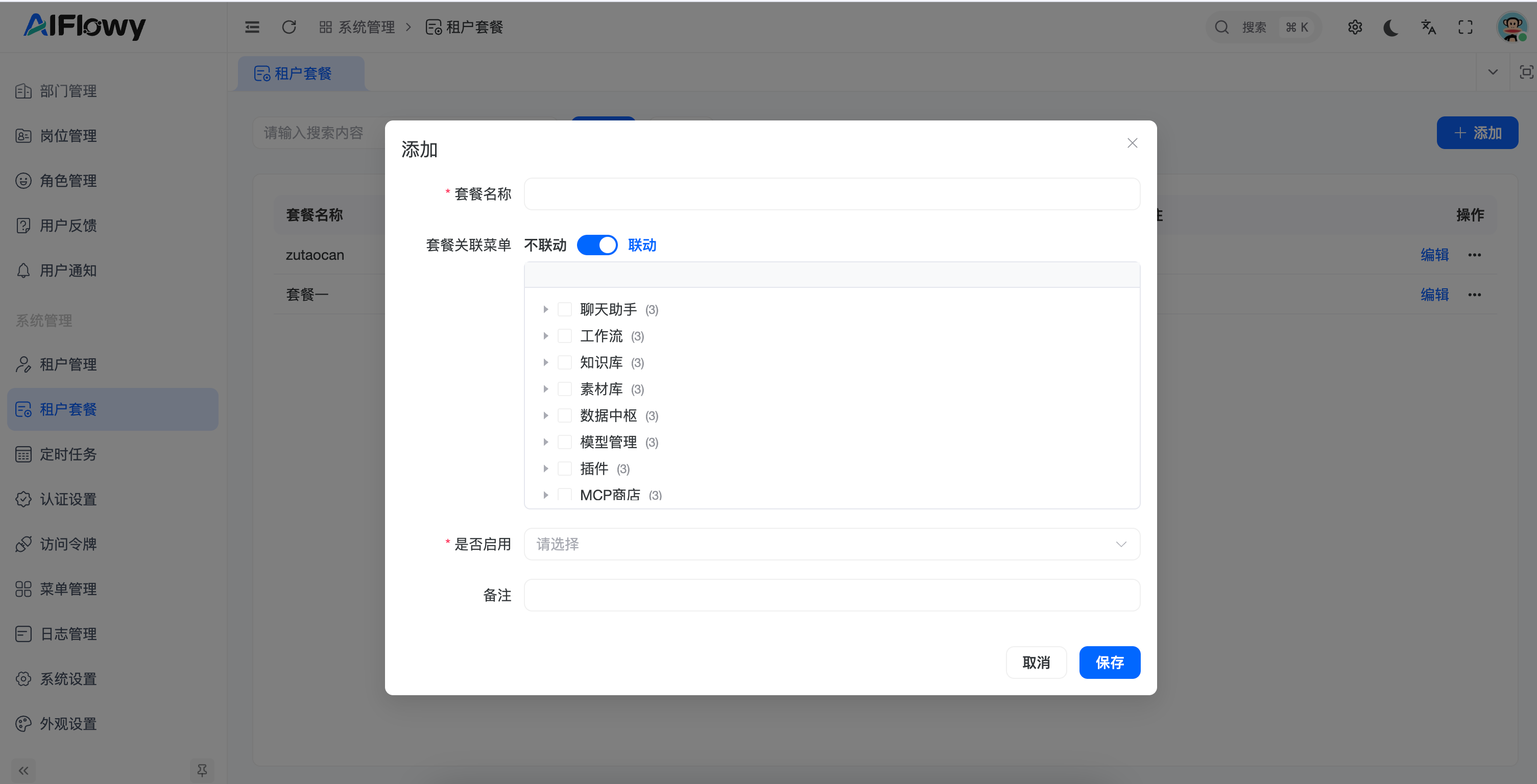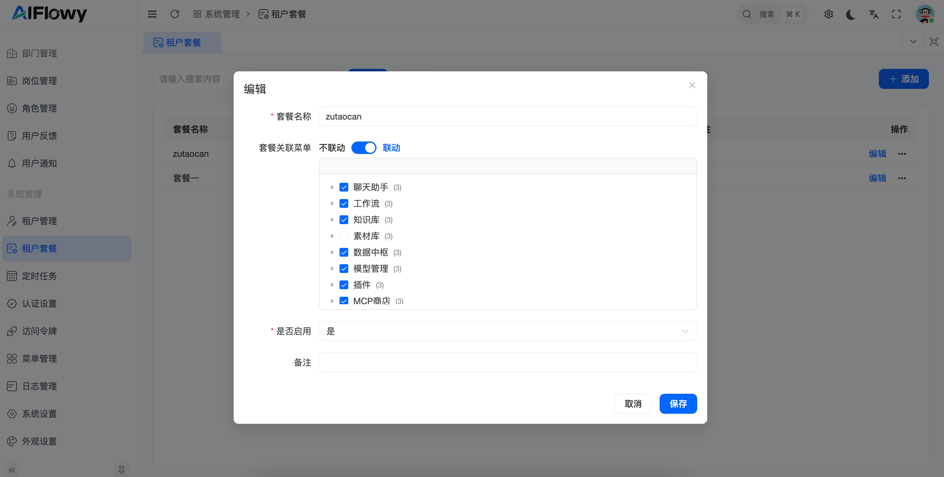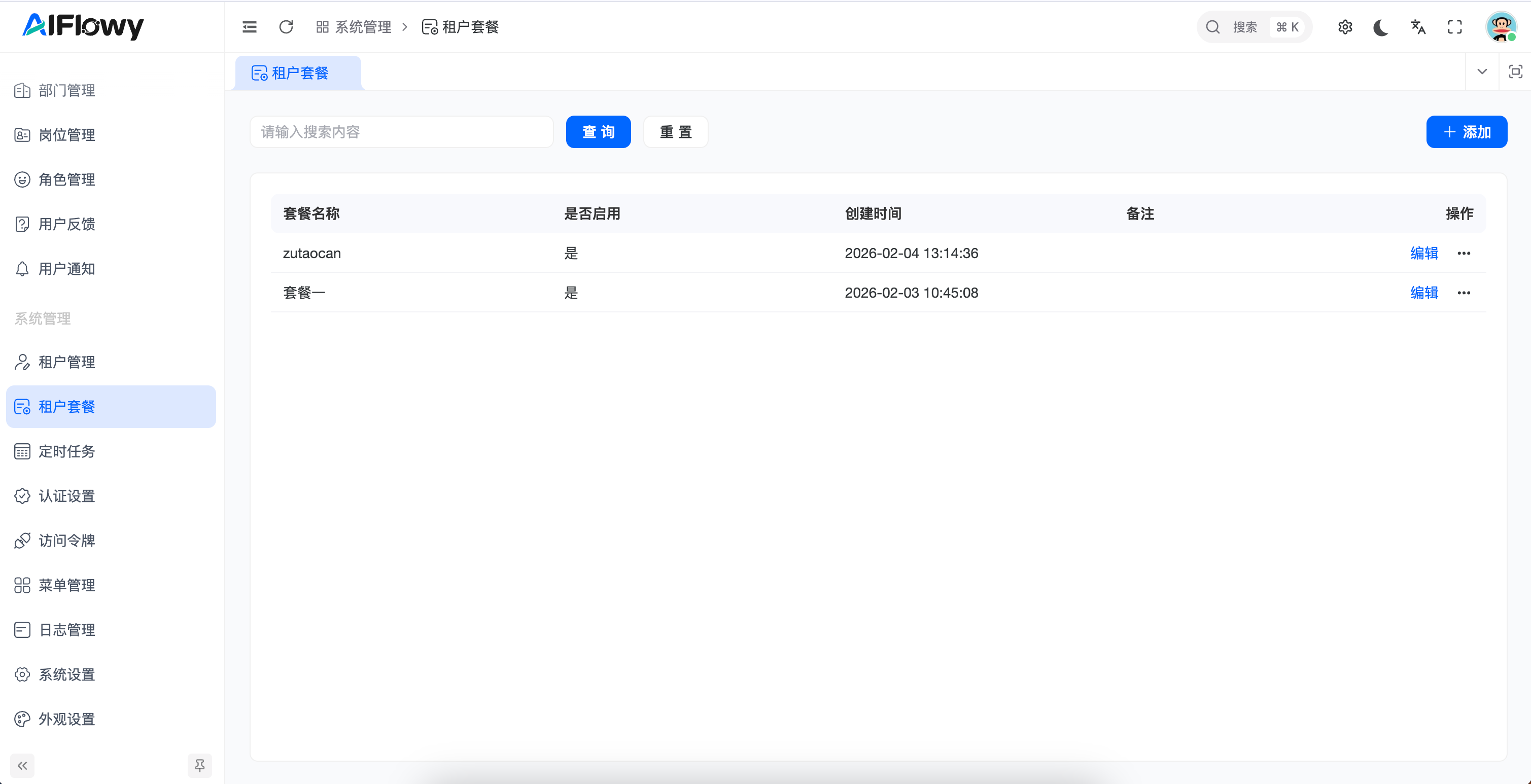 租户套餐 用于定义不同服务等级所对应的功能权限集合。通过套餐机制,管理员可以实现“一次配置,多租户复用”的高效管理模式,灵活控制不同租户可使用的功能范围。