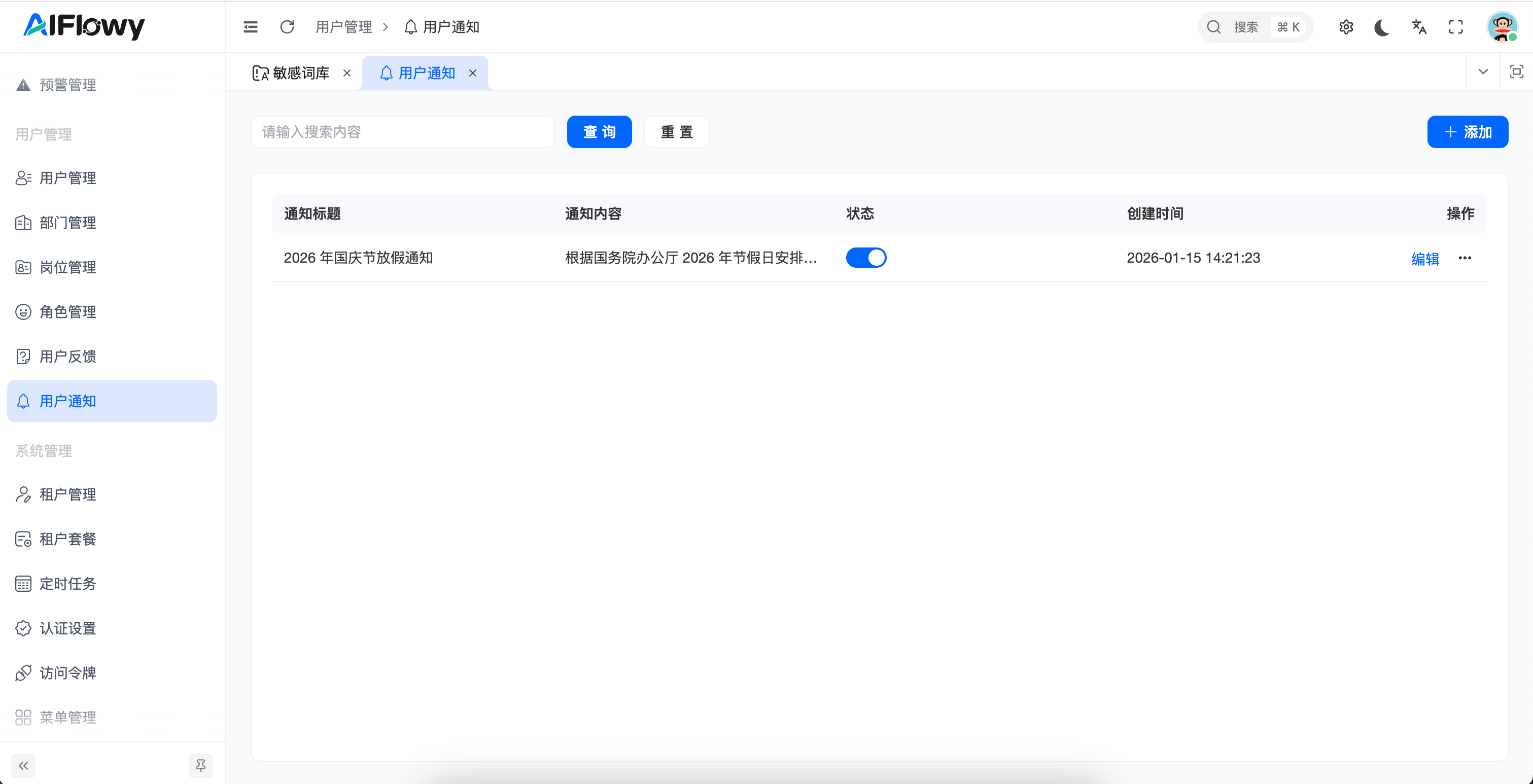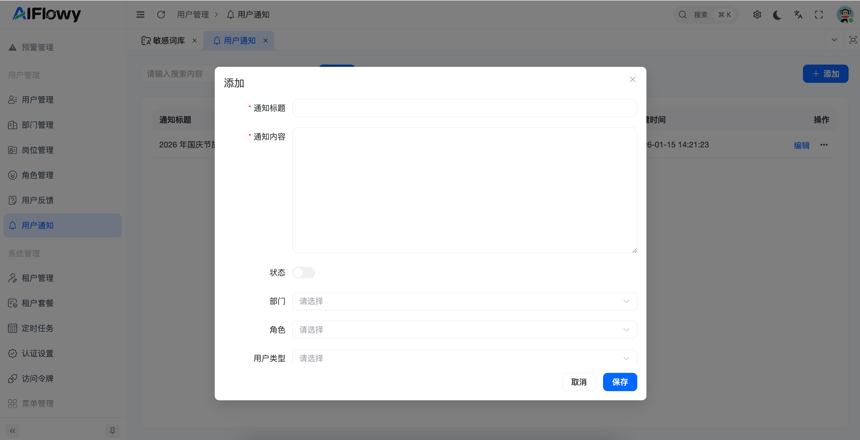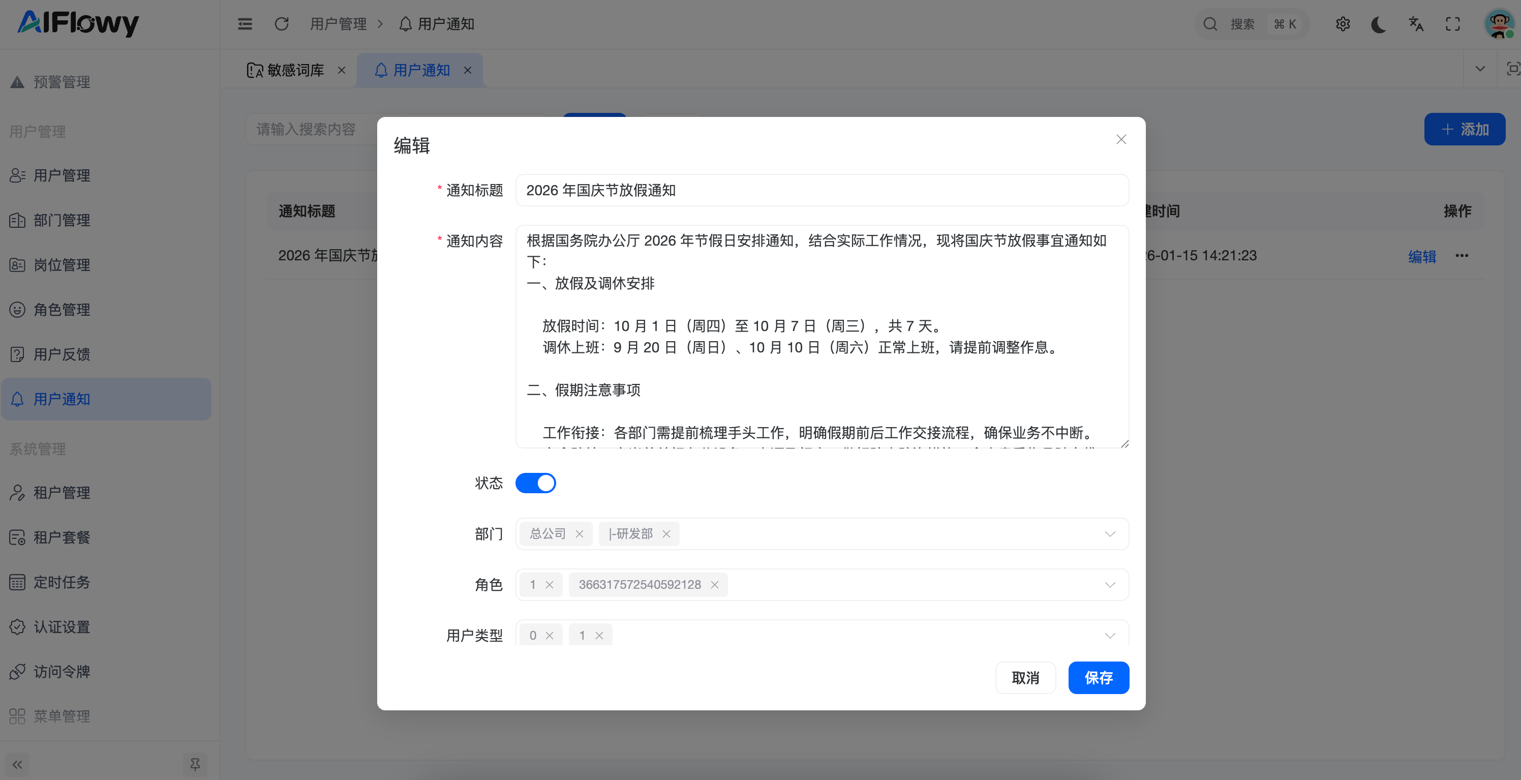 用户通知 模块是 AIFlowy 平台信息传递的核心。管理员可以通过该功能发布系统公告、放假通知或业务提醒。系统支持按 部门、角色、用户类型 进行精准定向投递,确保信息传达到位。